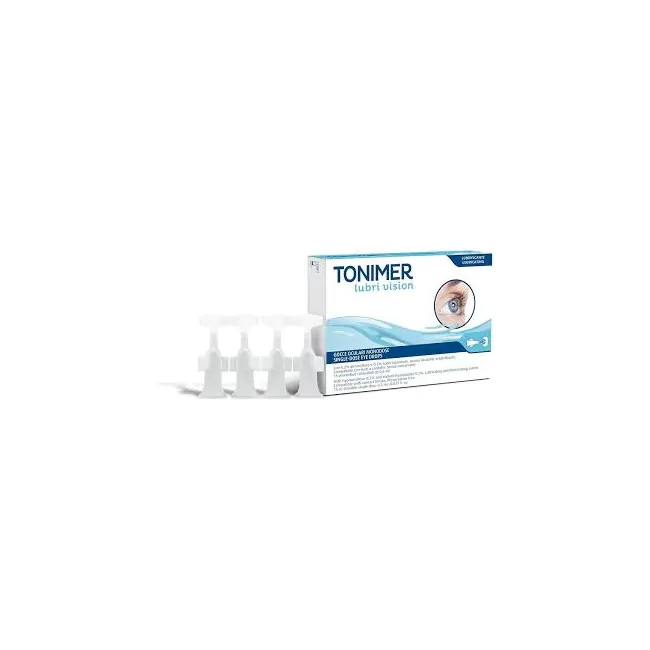 Tonimer Lubri Vision gocce oculari monodose è una soluzione oftalmica sterile a base di ipromellosa e sodio ialuronato, con un pH fisiologico; per una prolungata azione idratante e lubrificante della superficie oculare. L’assenza di conservanti consente l'utilizzo della soluzione anche da portatori di lenti a contatto. Somministrare prima di indossare le lenti a contatto. L’ipromellosa è un polimero viscoso con proprietà umettanti e mucomimetiche che creando uno scudo protettivo, trasparente e viscoelastico contribuisce a stabilizzare il film lacrimale. Grazie alle sue proprietà l'ipromellosa protegge e lubrifica la superficie oculare riducendo la sensazione di secchezza oculare e dona un sollievo a lunga durata agli occhi irritati, contribuendo a ristabilire il naturale film oculare. Il sodio ialuronato è un componente viscoso utilizzato per i suoi effetti idratanti e lubrificanti. Grazie alle sue proprietà crea un film viscoelastico e trasparente che protegge la mucosa oculare che va ad agire contro gli agenti esterni e contrasta un occhio moderatamente secco. Tonimer Lubri Vision gocce oculari monodose diminuisce i sintomi di secchezza agli occhi, bruciore, prurito e sensazione di corpo estraneo, contribuendo a ristabilire il naturale film oculare. Tonimer Lubri Vision gocce oculari monodose idrata e lubrifica a lungo la superficie oculare, dando sollievo prolungato ad occhi secchi causati da un uso eccessivo del PC, ammiccamento infrequente, trattamenti medici particolari, inquinamento atmosferico (es. aria condizionata, vento e sole) ed anche ad occhi stressati dall'uso delle lenti oculari.