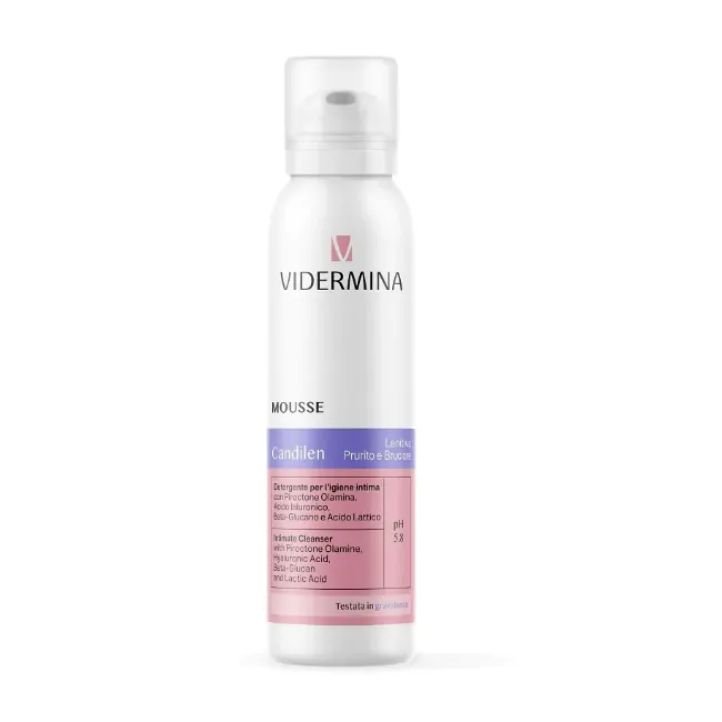 Vidermina Candilen mousse è una mousse detergente intima che svolge un'azione lenitiva di prurito e bruciore della zona genitale. A ph acido, la formula è arricchita con acido ialuronico e beta-glucano. Ideale per uso quotidiano.