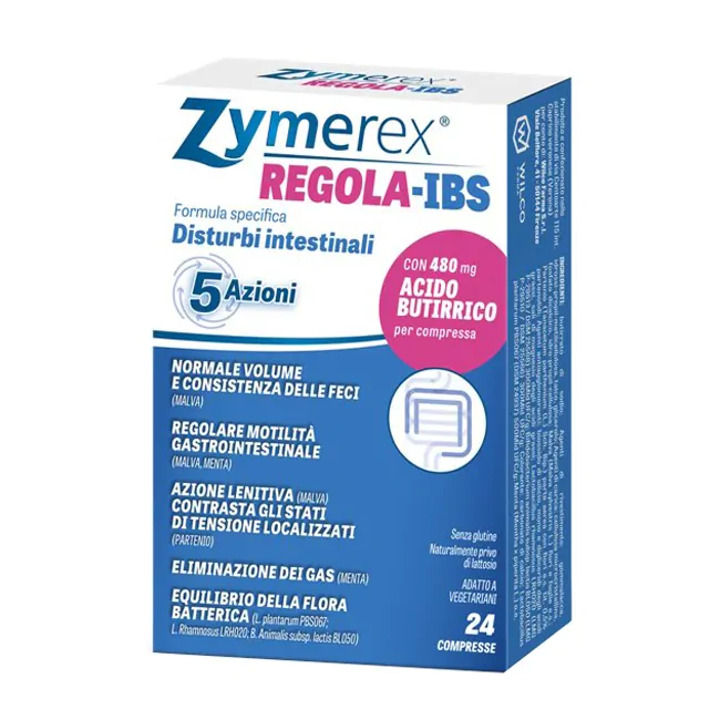 Grazie alla sua formulazione specifica, Zymerex Regola-IBS svolge 5 azioni sinergiche per favorire la normale funzionalità intestinale, inoltre, apporta circa 480 mg di acido butirrico per compressa.