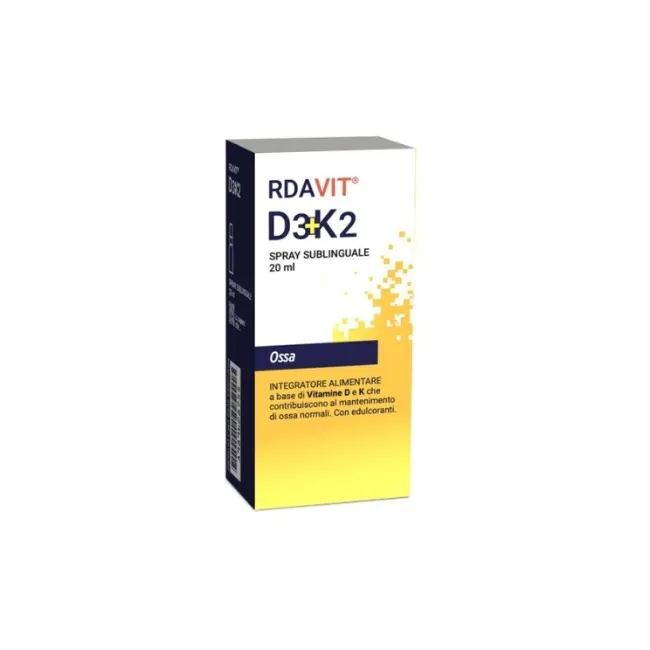 RDAVIT D3 + K2 Spray Sublinguale è un integratore alimentare a base di vitamine D e K. La vitamina D contribuisce al normale assorbimento del calcio e del fosforo e, insieme alla vitamina K, favorisce il mantenimento di ossa normali. Con edulcoranti. Senza glutine.