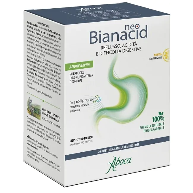 Aboca NeoBianacid è un integratore indicato per il trattamento di reflusso gastroesofageo, acidità di stomaco, bruciore e difficoltà digestive. Nello specifico, la sua azione è protettiva, lenitiva e antiossidante, senza alterare la fisiologia dello stomaco.