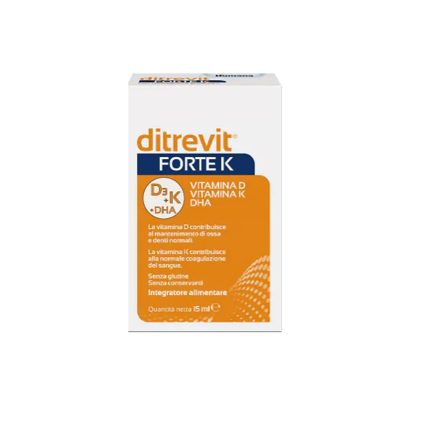 Ditrevit Forte K di Humana un integratore alimentare a base di vitamina D3, K e DHA, indicato nei bambini per contribuire allo sviluppo di ossa e denti sani e per la normale coagulazione del sangue.