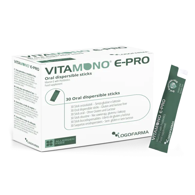 Vitamono E-PRO è un integratore alimentare a base di Vitamina E in forma libera (Tocotrienoli, Tocoferoli), combinata a due microrganismi probiotici, il Bifidobacterium Breve BR03 e il Lactobacillus rhamnosus LR05, microincapsulati.