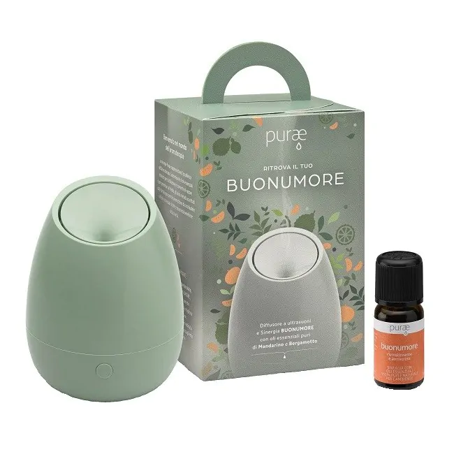 DescrizioneCofanetto con diffusore a ultrasuoni (capacità del serbatoio: 100 ml), sinergia BUONUMORE (flacone da 5 ml) con oli essenziali puri di Mandarino e Bergamotto.