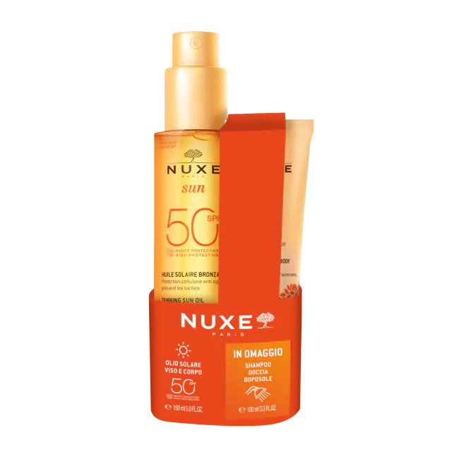Nuxe Sun Olio solare abbronzante SPF50+ per viso e corpo 150 ml + shampoo doccia 100 ml OMAGGIO